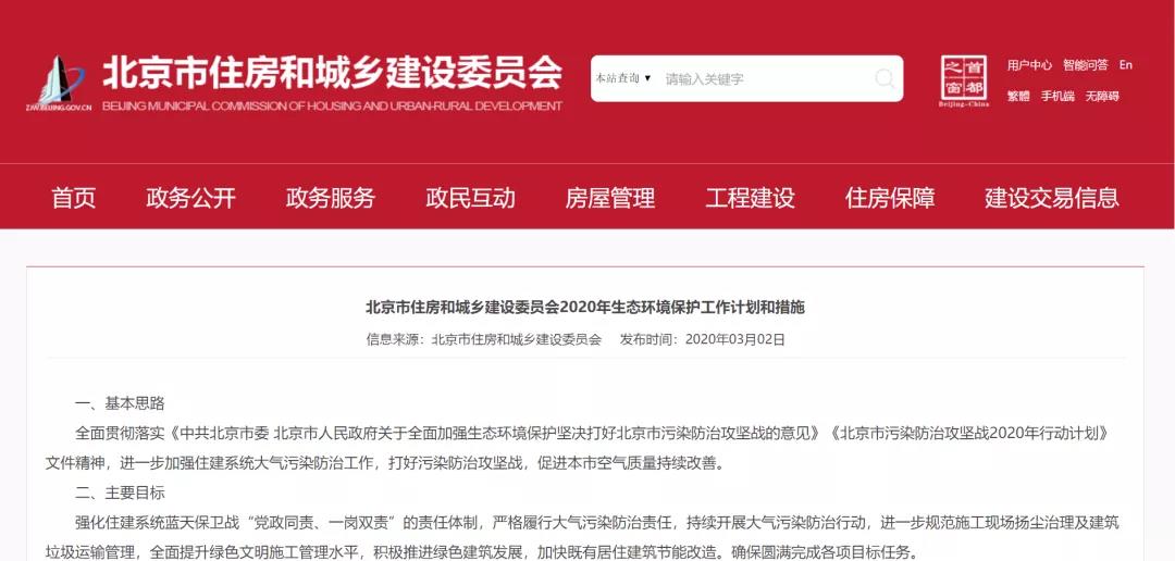 2020年3月2日,北京市住房和城鄉(xiāng)建設委員會發(fā)布《2020年生態(tài)環(huán)境保護工作計劃和措施》的通知,內(nèi)容強調(diào):